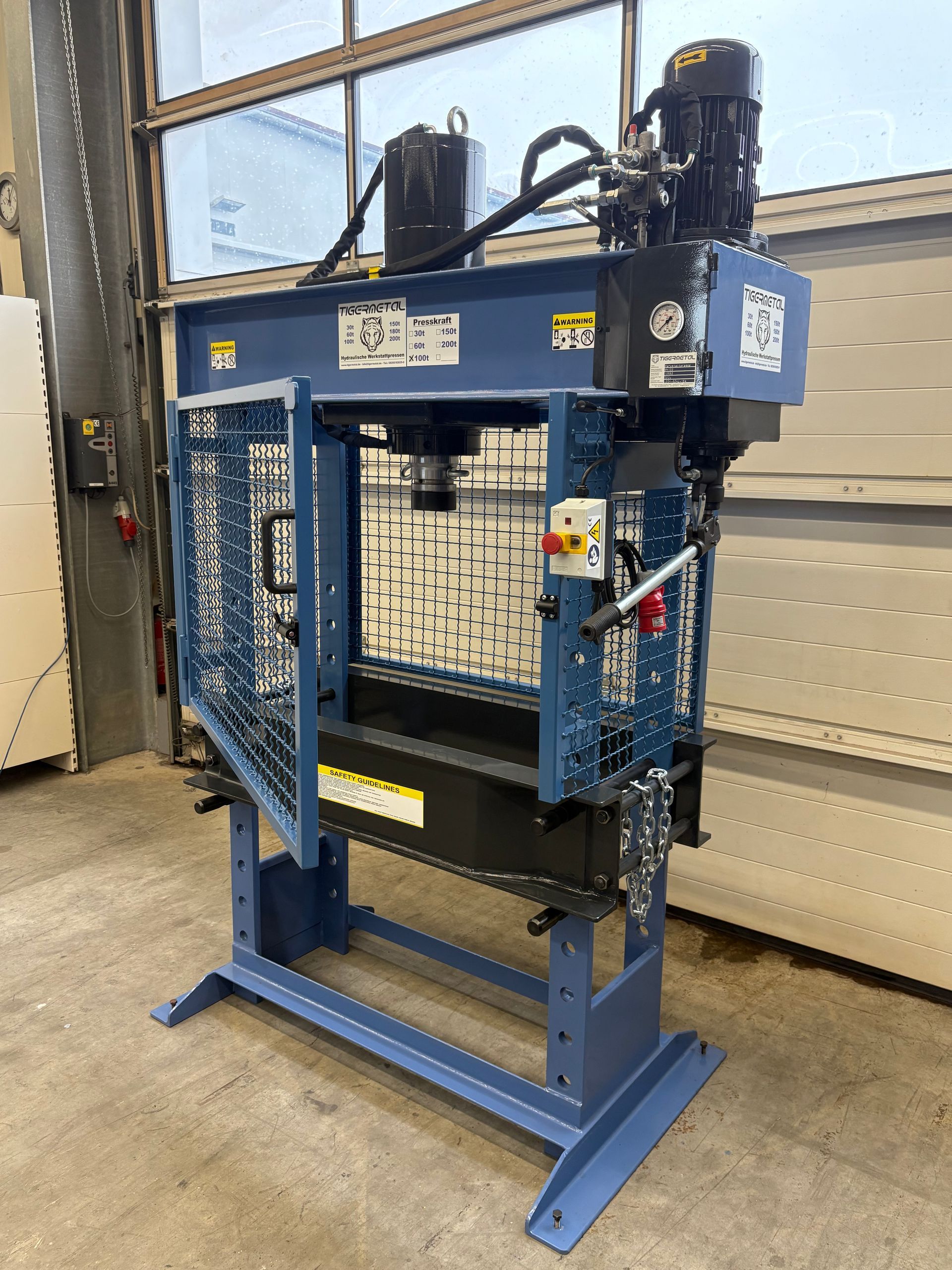 Hydraulic workshop press with 100 tons of pressing force and additional steel mesh to protect the operating personnel. Access to the press room is via an opening safety door from the front.